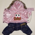 Модные теплые комбинезоны в виде блестящей курточки и джинсовых штанишек. На спинке яркий принт. Капюшон украшен искусственным мехом. Застегивается на три кнопки. Внутри искусственный мех. Два цвета: розовый и серый.
